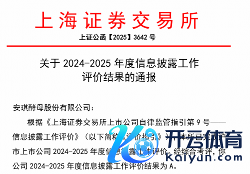 近日,上海证券来回所发布了《沪市上市公司2024至2025年度信息知道责任评价成果》,安琪酵母再次取得A级(优秀)评价。在参与评价的2263家上市公司中,仅430家获此评级,占比约19%。这已是公司第九次获评A级,充分体现了监管机构与本钱市集对公司在公司处治、范例运作及投资者干系料理等方面责任的高度认同。