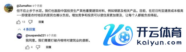 在 Youtube 磋磨视频下,不少网友对丹格特一家独大暗示不悦,迎接中国水泥企业干预尼日利亚市集,以压低水泥价钱,促进经济发展,也有网友缅念念服务、对中国水泥坐蓐投资过度依赖影响土产货产业牢固与发展的问题。