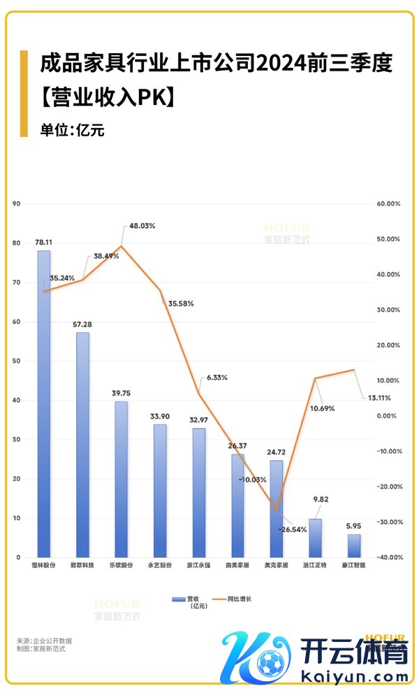 从前三季度营收数据图表来看,9家上市公司中,各级梯队间的营收限制赫然,恒林股份、致欧科技两家头部企业离别以78.11亿元、57.28亿元占据前两位,连接了半年报工夫的发展态势。致欧科技称,营收增长主要系公司新品拓展告成,营销力度增强,销售限制扩大所致。