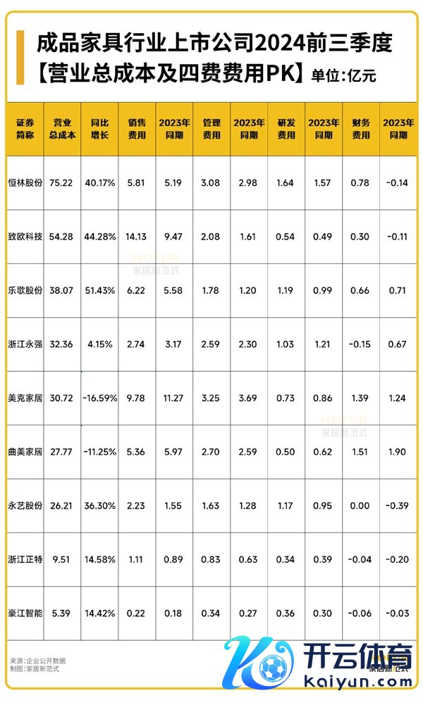 9家上市公司中,营业总老本的花费情况基本与营收限制成正比,比如营收最高的前三家上市公司恒林股份、致欧科技和乐歌股份,他们糜费的老本也最高,离别以75.22亿元、54.28亿元、38.07亿元排行前哨,而况均以最初40%的幅度在同比增长,其中乐歌股份更所以51.43%的老本增速居于第一。