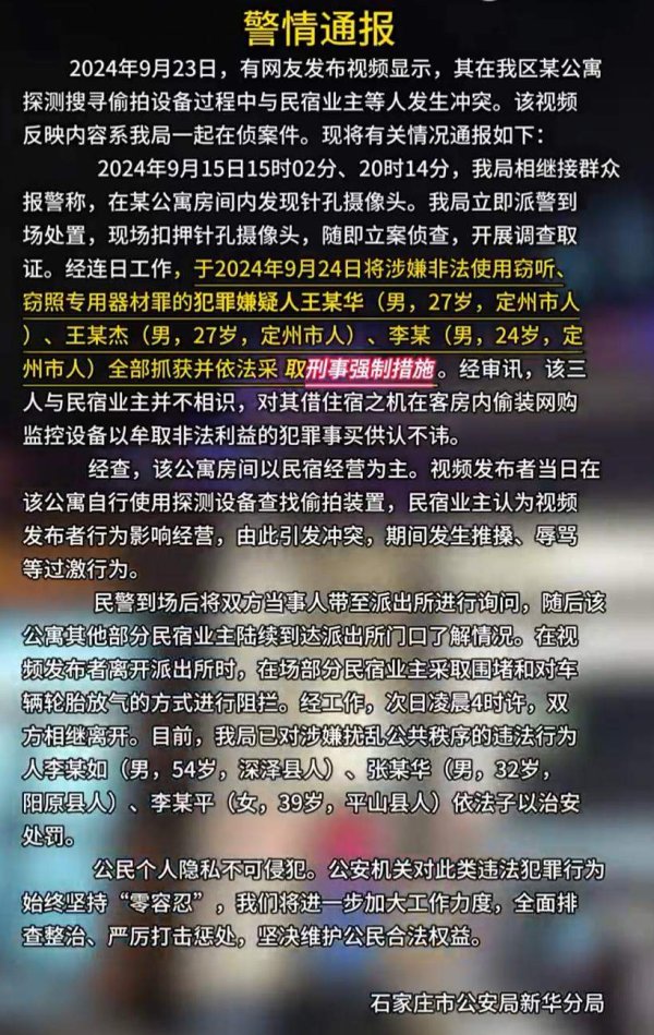 据警方通报,9月24日,石家庄市公安局新华分局已将涉嫌违法使用窃听、窃照专用器材罪的王某华、王某杰、李某等三东谈垄断获,并照章继承刑事强制法度。这三东谈主与民宿业主并不贯通,对其借住宿之机在客房内偷装网购监控建筑以牟取违法利益的作歹事实供认不讳。