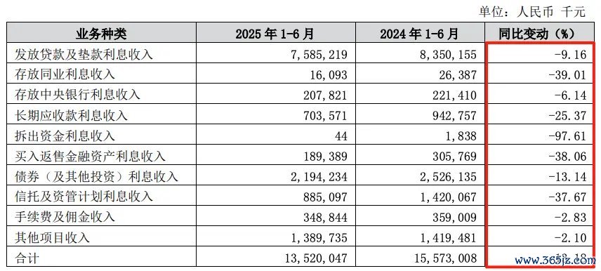 正如贵阳银行我方所说,利息收入是负担该行营收的主要原因。本年上半年,贵阳银行的各项业务收入共135.2亿元。在该行的收入结构中,披发贷款及垫款利息收入占比56.1%。限度6月末,贵阳银行该项利息收入为75.85亿元,降幅9.16%。
