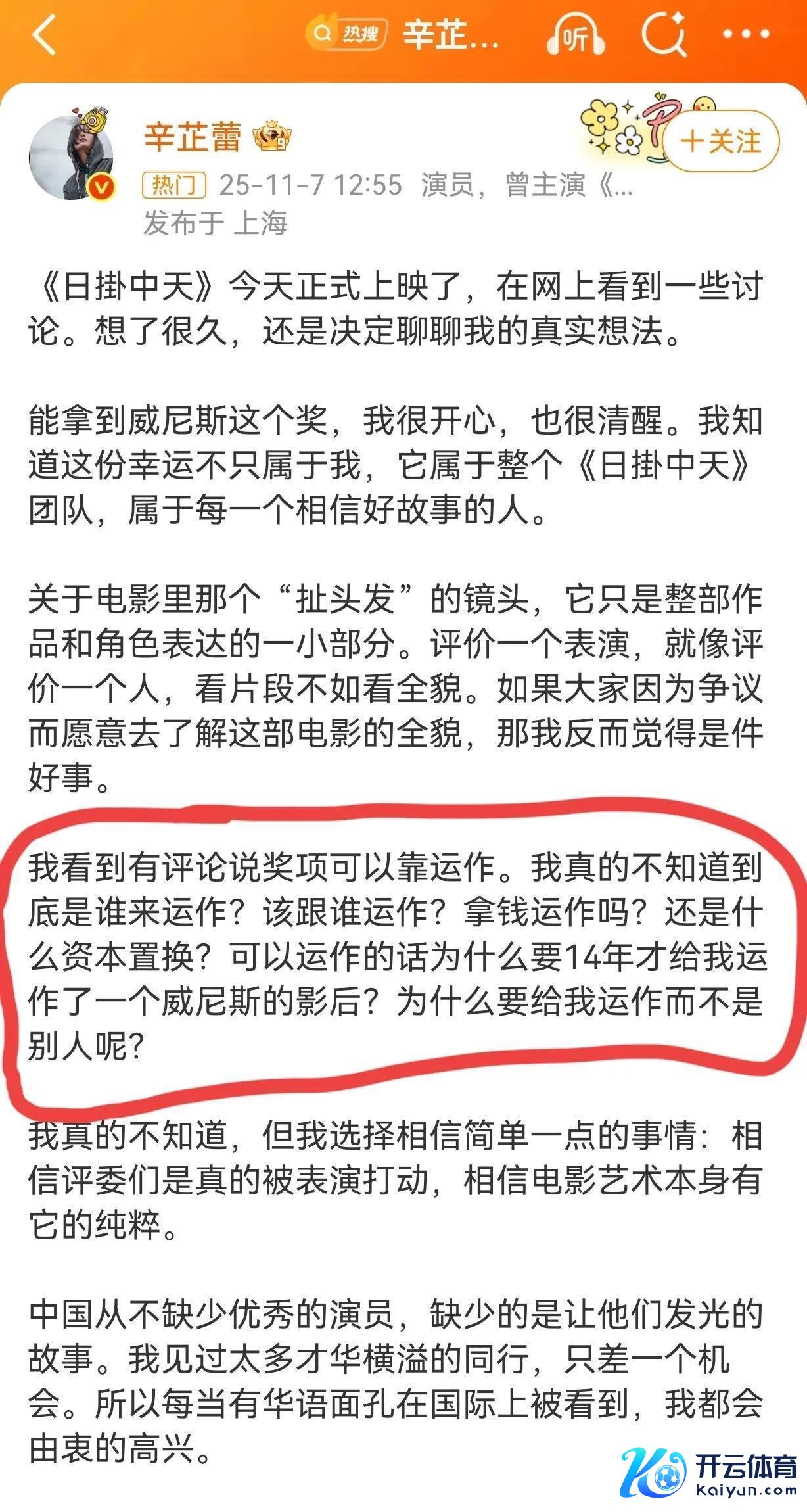 今天文娱圈又炸锅了!辛芷蕾短暂在搪塞媒体上发了一篇长文欧洲杯体育,径直开怼那些说她“靠运作拿到威尼斯影后”的传言。 这事儿还得从一张疑似郝蕾的一又友圈截图提及——里头阴阳怪气地说什么“靠扯头发拿影后”,明眼东说念主一看就知说念在说谁。 1. 六连问怼得漂亮:运作?我跟谁运作?拿钱吗?辛芷蕾小数没怂,甩出六个连环问:“谁来运作?该跟谁运作?拿钱运作吗?”“真要能运作,为啥等我14年才给个奖?为啥选我不选别东说念主?”她没骂东说念主,但每个问题都戳到痛点。说白了,这话里带着屈身:我辛穷困苦拍戏十几