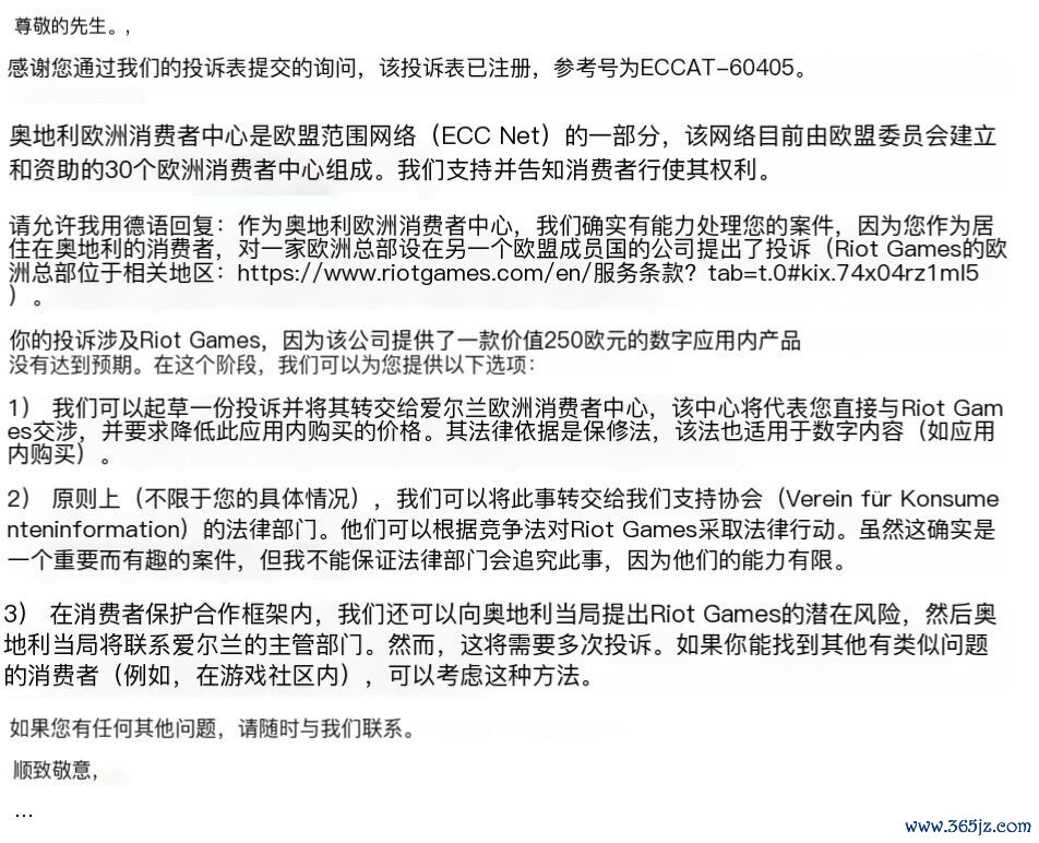 7月25日发帖后阅历一个月千里寂,该用户于8月29日带着奥地利欧洲亏本者中心的回答追念,并公布了三种可摄取的行径决策。他采选第三项:尽可能积累玩家投诉,平直提交奥地利当局代表玩家与拳头交涉。此事将随后转至拳头欧洲总部地方地爱尔兰政府进行直面处置。