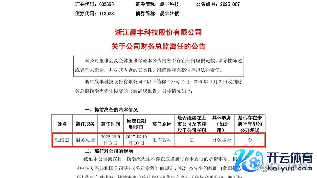 先摆事实,别战抖下定论,望望公告怎么说,9月5号那天晨丰科技自信满满地甩出财务总监下野公告,钱浩杰递交书面辞职敷陈,CFO头衔不要了,但如故在公司任职,转成财务主宰继续托底,按理说,辞去高管职务转为相对次一级管制岗,这可不是小变动,公司东谈主事这盘棋下得挺有深意,外东谈主看似升降潮起,其实思潮腾涌,说不定是另一套政策在暗暗落地。