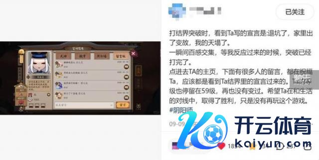 我思到最近在小红书刷到的一个帖子。它讲解了一位玩家在打冲破时,发现阿谁结界的主东说念主是一位几年前就退坑的玩家。结界简介抒发了主东说念主出于一些践诺原因,无法再无间玩这款游戏。