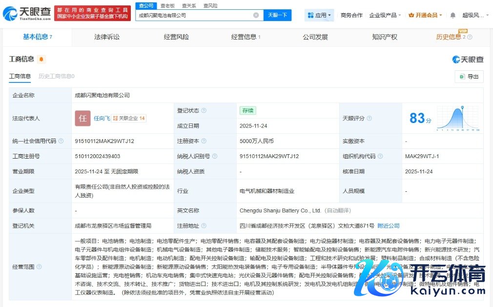 天眼查App涌现,近日,成王人闪聚电板有限公司诞生开云体育(中国)官方网站,法定代表东说念主为任向飞,注册老本5000万东说念主民币,方针界限包括电板销售、电板制造、电板零配件坐褥、电板零配件销售等。推进信息涌现,该公司由浙江祥瑞汽车零部件产业有限公司全资执股。