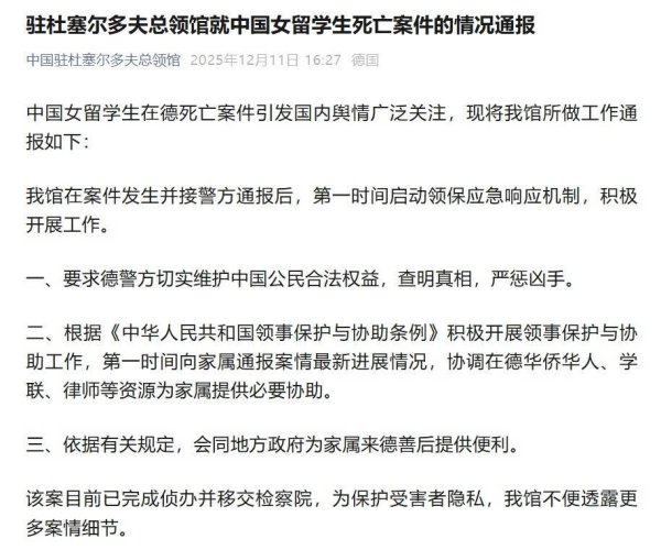 12月11日,中国驻杜塞尔多夫总领馆就中国女留学生物化案件发布情况通报。