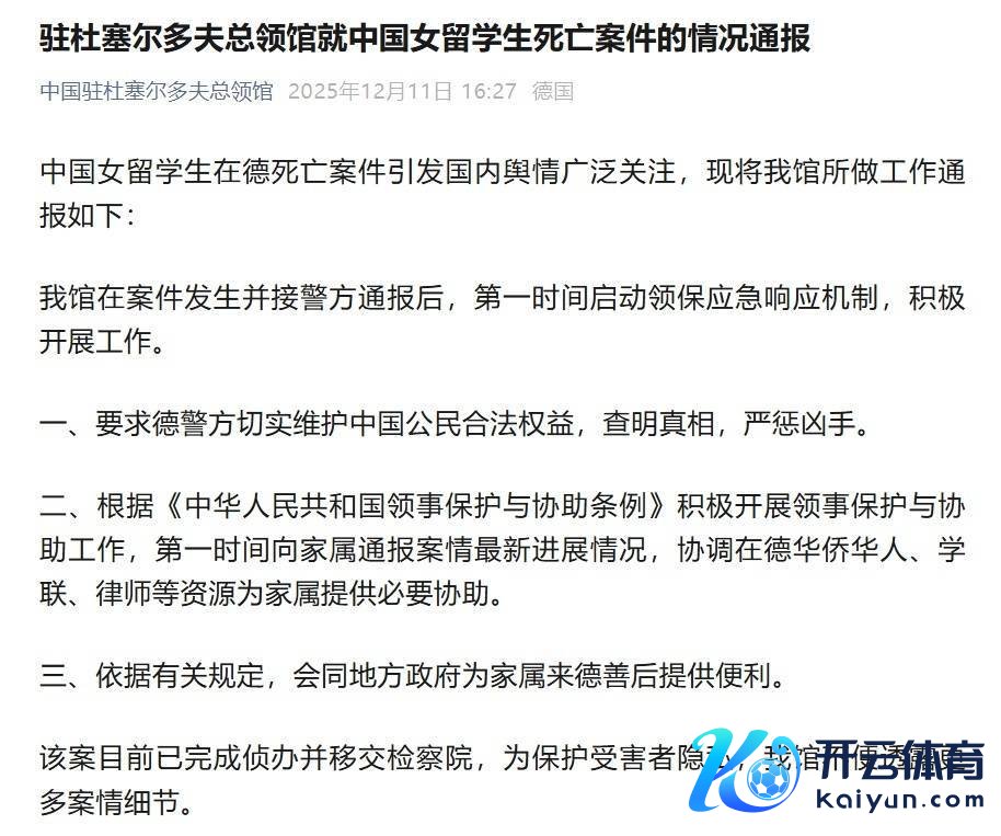 近日欧洲杯体育,“又名中国女留学生与其孩子在德国株连”一事激发柔和。 12月11日,中国驻杜塞尔多夫总领馆就中国女留学生物化案件发布情况通报。 中国女留学生在德物化案件激发国内舆情平淡柔和,现将我馆所作念责任通报如下: 我馆在案件发生并接警方通报后,第一时刻入手领保救急反映机制,积极开展责任。 一、条目德警方切实爱戴中国公民正当职权,查明真相,重办凶犯。 二、把柄《中华东说念主民共和国领事保护与协助条例》积极开展领事保护与协助责任,第一时刻向家属通报案情最新推崇情况,融合在德华裔华东说念主、学